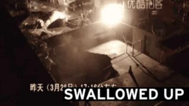 A massive sinkhole apparently brought on by heavy rain opened up in Shezhen, China, swallowing a security guard alive and causing nearby residents to evacuate. Yang Jiabin, 25, was walking in the Futian district near new construction yesterday afternoon when the ground gave way beneath him, opening into a 26 foot-wide, 52 foot-deep crater; despite the quick arrival of rescue workers, he reportedly died on-scene. The incident was capture on two closed-circuit TV cameras, and video was quickly uploaded to the Chinese sharing site Youku:
