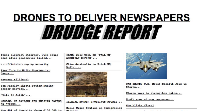 For about 20 minutes this morning, the top headline on the Drudge Report was "DRONES TO DELIVER NEWSPAPERS." It was a nice bit for Drudge, one that satisfied both his obsession with drones and his obsession with media, and had a good future-shock value for his aging, perpetually terrified audience. It was also, obviously, an April Fool's Day joke.