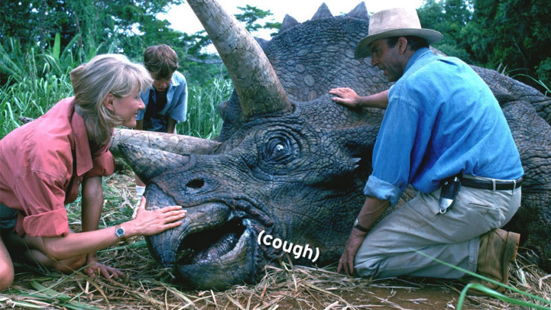 I think my favorite part of the movie occurs relatively early on, when the tour group consisting of Grant, his fellow paleontologist Dr. Ellie Sattler (the always mesmerizing Laura Dern), Malcolm, the grandkids of the park's owner and a lawyer that everyone (including the T. Rex) hates, stops at the side of the road to check out a triceratops. This is when wonderment is still fresh, before the fiendishly fat Dennis Nedry (aka Wayne Knight aka Newman) shuts down power, allowing the dangerous dinos to roam the park in, as luck would have it, a monsoon. Kneeling next to this passive monster, Sattler gushes "She's the most beautiful thing I ever saw!" The glint in Grant's eye confirms that he's right there with her. Meanwhile, the multi-ton motherfucker is lying on its side, wheezing, literally foaming at the mouth. What a bizarre creative decision—that isn't beauty, that's death. A brachiosaurus that snots all over Tim's sister Lex (Ariana Richards) and the T. Rex's bitchy attitude suggests that Jurassic Park is one of those sad zoos that's kind of rundown, where all the animals are kind of sick. It hasn't even opened yet. Cool thing to gasp at, everybody.