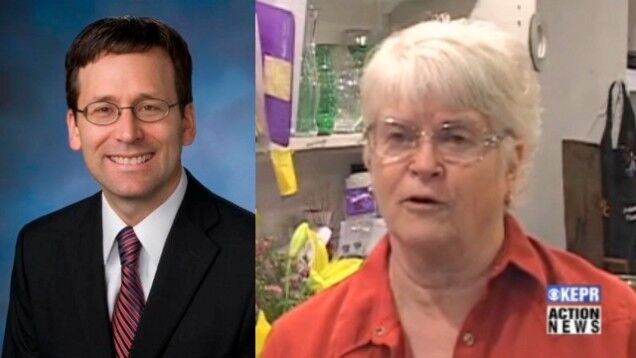 Though Washington voters approved the legalization of same-sex marriage back in November, Arlene's home county of Benton in conservative eastern Washington roundly rejected the referendum, with 63% voting against it.