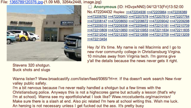 "Hey /b/ it's time," he wrote at 1:52 p.m., addressing the anarchic and gleefully amoral /b/ subboard. (4chan has a high rate of turnover, and the thread has since been deleted, most likely automatically; we were provided with an archive and screenshots.)