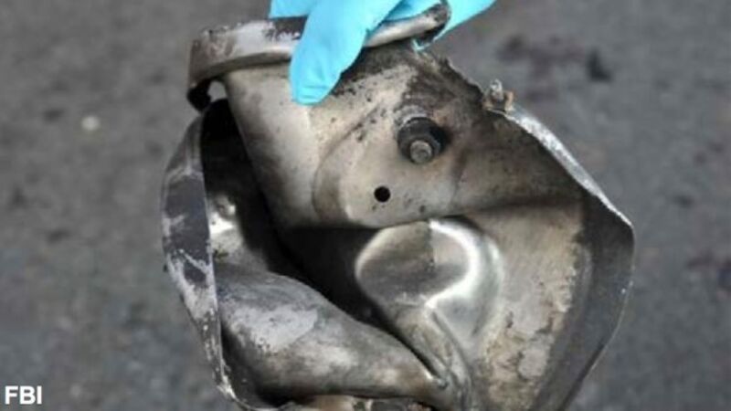 Three photos show what Fox 5 describes as pieces of a stainless steel pressure cooker. The fourth photo shows a shredded black nylon bag, the same type investigators believe were used to disguise the bombs.