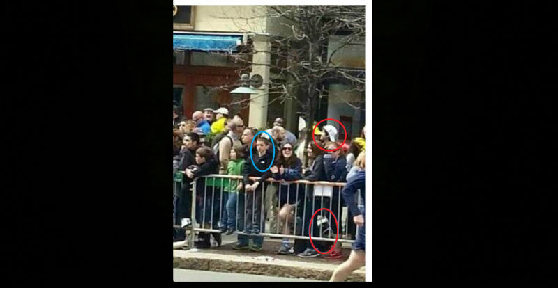 Reddit has found another eerie piece of photographic evidence in the Boston Marathon bombing. The photo above shows bombing victim Martin Richards, 8, circled in red, standing on the barrier while the individual, now only known as Suspect #2, circled in green, passes just feet behind him, possibly in the act of leaving his backpack behind or having just done that.