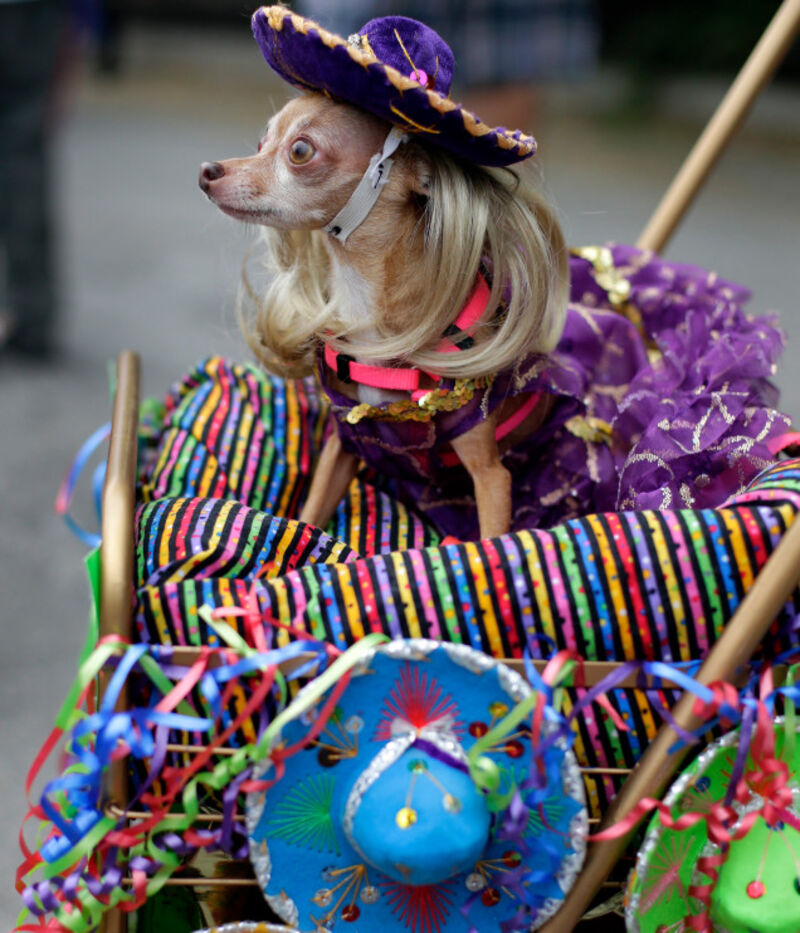 A dog in a hat and wig, whose name is Lupita and who looks fearful for its life, sits atop a handmade palanquin of sorts, decorated in other hats and garb. Lupita was a contestant in today's Fiesta Pooch parade in San Antonio, to her dismay. Via Eric Gay/AP