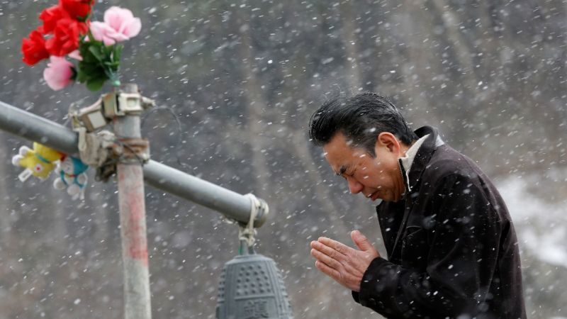 [A man prays in front of the main entrance of Okawa Elementary School, where 74 students went missing after the 2011 tsunami in northern Japan. Tuesday marks the third anniversary of the earthquake and tsunami that killed 15,884 people and left more than 2,600 unaccounted for in vast areas of its northern coast. Image via Shizuo Kambayashi/AP.]