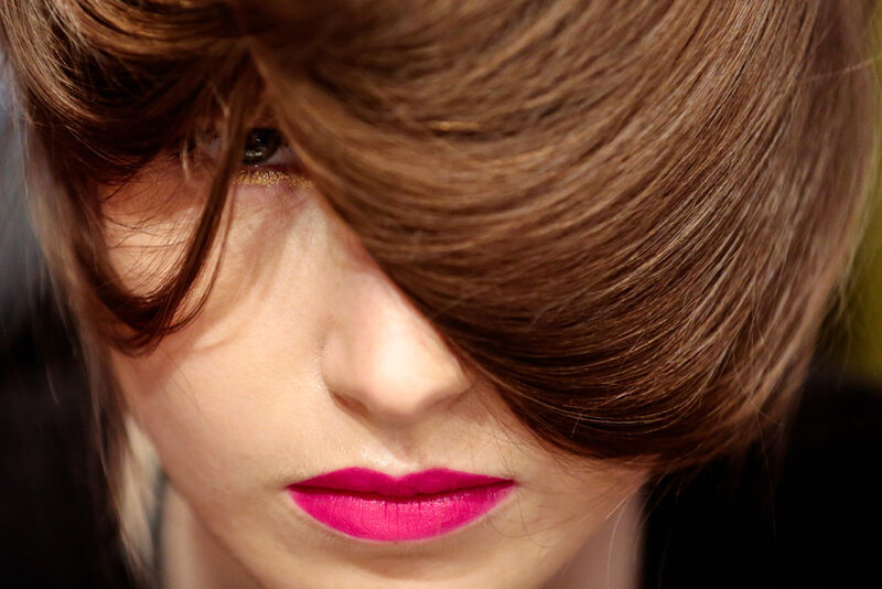A model has her hair styled before walking in Austrian designer Lena Hoschek's runway show presenting her Spring/Summer 2015 collection at Mercedes Benz Fashion Week in Berlin. Hoschek's new pieces featured African-inspired prints. Image by Markus Schreiber via AP.