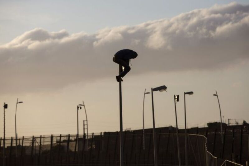 A sub-Saharan migrant sits on top of a pole set in a metallic fence that divides Morocco and the Spanish enclave of Melilla on Wednesday. During a pre-dawn border storming, police from both sides tried to prevent dozens of the sub-Saharan migrants from entering from Morocco. Image via Santi Palacios/AP.