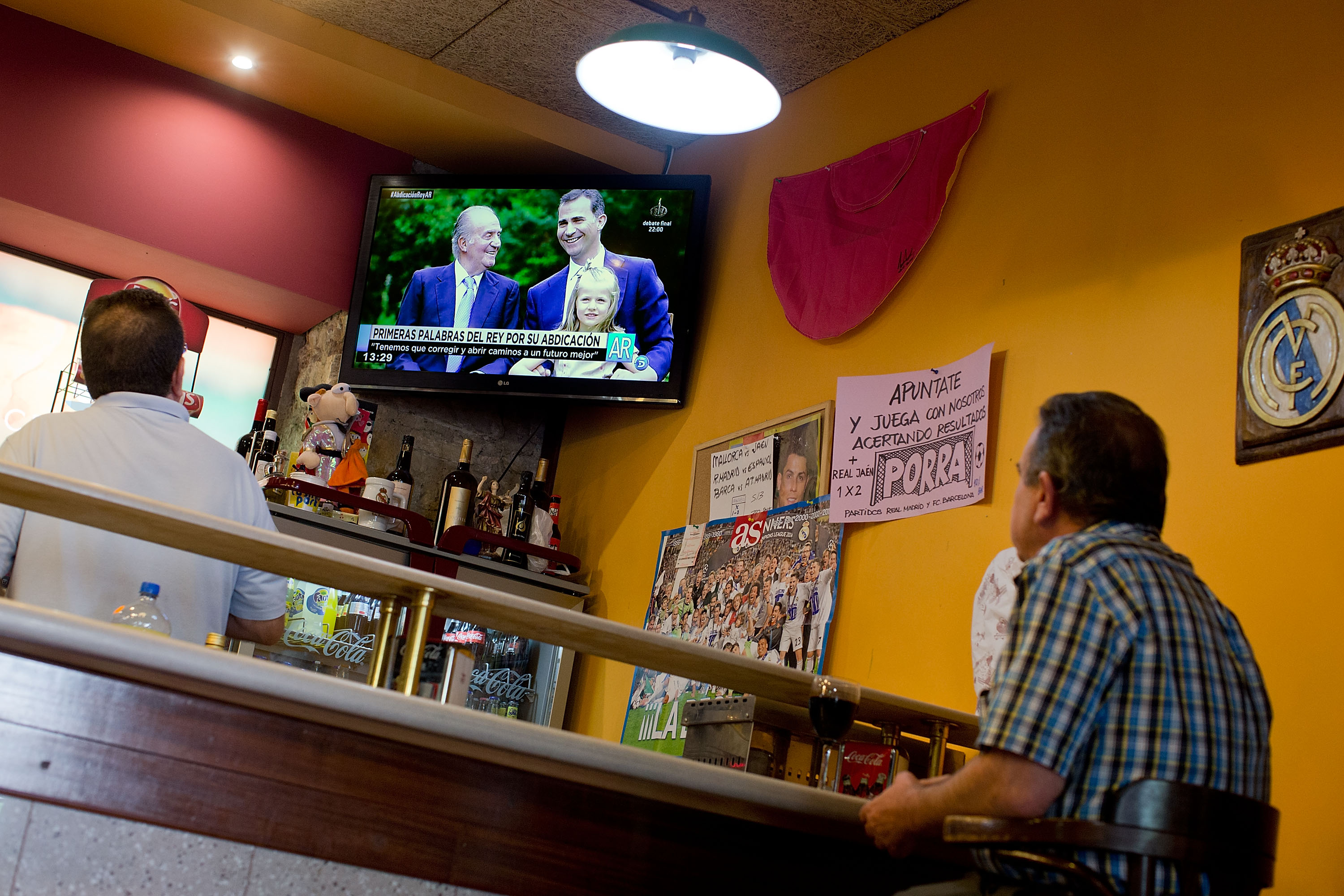 A waiter and a man at a tavern in Jaen, Spain, watch TV coverage of King Juan Carlos of Spain's abdication on Monday. King Juan Carlos renounced the throne after 39 years and will be succeeded by his son, Prince Felipe. Image via Gonzalo Arroyo Moreno/Getty.