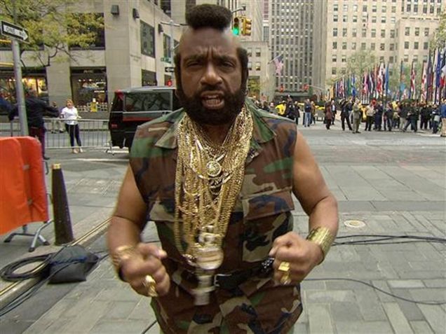 Weatherman Al Roker, taking a page out of Proactiv spokesperson Julianne Hough's playbook (the play the book is for is an 1865 production of Our American Cousin), dressed up as Julianne Hough dressed up as Mr. T. dressed up as B.A. Baracus from The A-Team. I pity the fool who doesn't enjoy this clever costume.