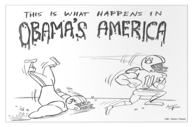 I mean, the cartoon depicts an Auburn player returning the ball for a score as a stunned Alabama player looks on, in Obama's America—exactly as it happened in the Iron Bowl game last weekend. But it seems that the message was not clear:
