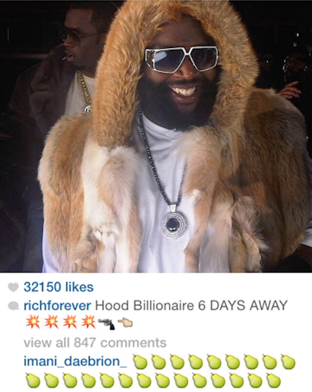 This is a small but extremely representative sample of what Rick Ross sees every time he peeks at his notifications tab on Instagram. Rick Ross has become the most famous pear-eater in America.