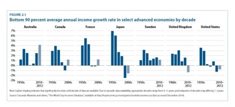 Declining worker bargaining power, for example, appears to be a global trend. A job in many European countries can be offshored as easily as a job in the U.S. Midwest, which has been the case for workers across the manufacturing sector in high-wage countries. Yet nations that have robust minimum wages and protections for workers that empower their voice in the workplace have not seen such a strong divergence between worker productivity and worker pay. Indeed, Australia's workers face the same global trends, yet its switch to collective bargaining over and above a strong set of minimum conditions has helped workers keep more of their productivity gains in take-home earnings.