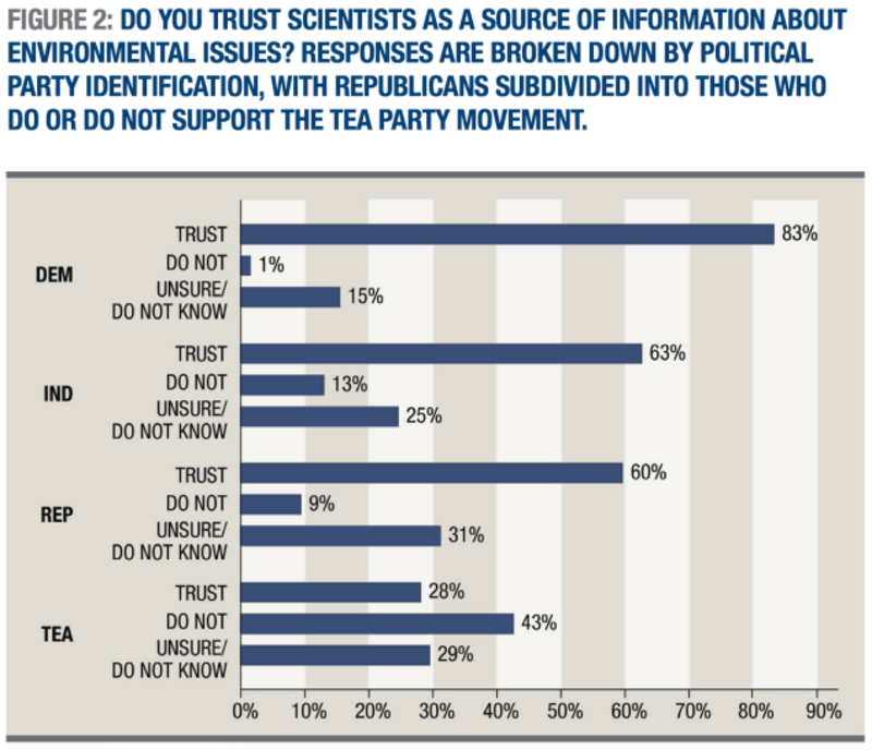 This is pretty striking: The first three political groups—Democrats, independents, and non-tea party Republicans—all trust scientists on the environment. But then you come to tea party members, and suddenly, distrust in scientists soars. The numbers are stark: 60 percent of traditional Republicans trust scientists on the environment, versus only 28 percent of tea partiers.