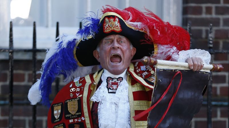 In a Monday, July 22, 2013 file photo, Tony Appleton, a town crier, announces the birth of the royal baby, outside St. Mary's Hospital exclusive Lindo Wing in London. Well-wishers waiting outside St. Mary's Hospital in London might have been forgiven for thinking Appleton had the royal seal of approval. Appleton is in fact a crier, but in Romford, a commuter town just east of London, and in Bury St. Edmunds, a market town in southeastern England, not Buckingham Palace. In an interview Wednesday, July 24, he acknowledged that he had no official royal role, but simply showed up in costume after getting a tipoff that the Duchess of Cambridge had given birth. Confused American journalists identified him as a bona fide mouthpiece for Buckingham Palace.(AP Photo/Lefteris Pitarakis, File)