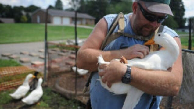 Army veteran Darin Welker, 36, has been raising 14 ducks as a form of therapy after sustaining a back injury in Iraq in 2005. Welker started keeping the ducks in the yard of his West Lafayette, Ohio home since March of this year, and has since received citations from town officials, who are demanding he get rid of the ducks. West Lafayette officials are citing a law adopted in 2010 that expressly forbids the keeping of "live poultry or fowl of any kind" (among many other animals).