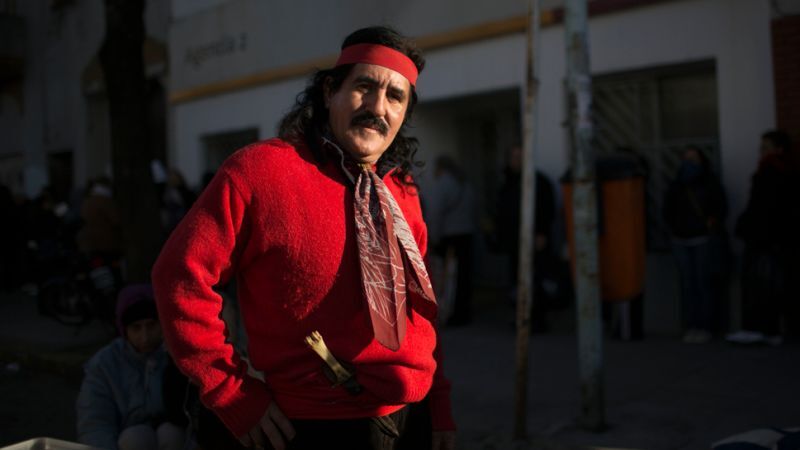 Angelito Ribero, dressed as folk saint Gauchito Gil, stands outside the San Cayetano church in Buenos Aires, Argentina. Legend holds that Gil was a 19th century outlaw who robbed the rich to give to the poor. His spirit is believed to perform miracles. Image by Natacha Pisarenko via AP.