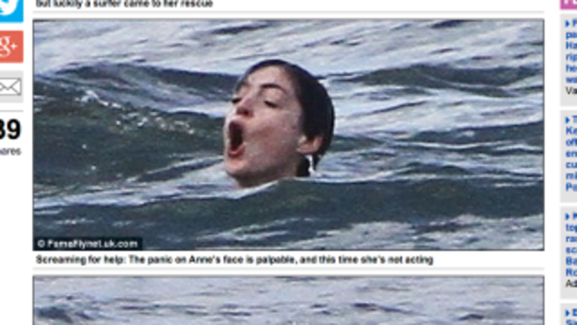 Radar reports that Hathaway, who was vacationing with her husband Adam Shulman, began "screaming" for help after becoming caught in a rip current while swimming. A nearby surfer, who will forever leave all the TVs in his home tuned to ABC Family on the off chance a Saturday afternoon airing of "The Princess Diaries 2: Royal Engagement" provides him with the chance to smile sheepishly and announce, "Y'know, I saved her life…" pulled her to safety. Back on the sand, Hathaway's husband inspected an injury on her foot (WITH HIS MOUTH). Though the experience of nearly drowning was surely terrifying, Hathaway eventually seemed fine, and will probably use the incident as fuel for her craft at a later date.