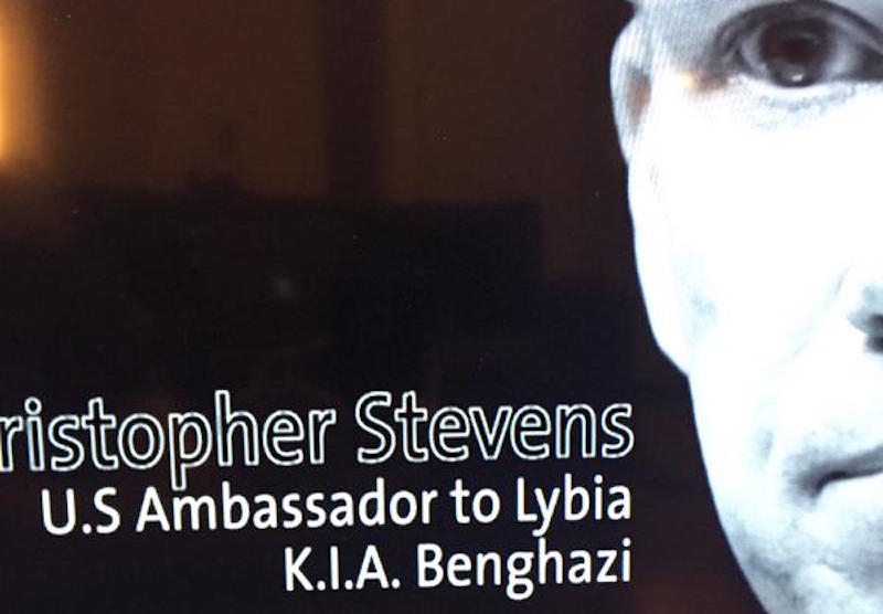 During tonight’s debate between Bernie Sanders, Hillary Clinton, and some custodial employees of the Wynn Las Vegas, StopHillaryPAC.org aired a generic Benghazi conspiracy theory clip blaming Clinton for the death of Ambassador Christopher Stevens. It contains three typos, including the name of the country in which he died.