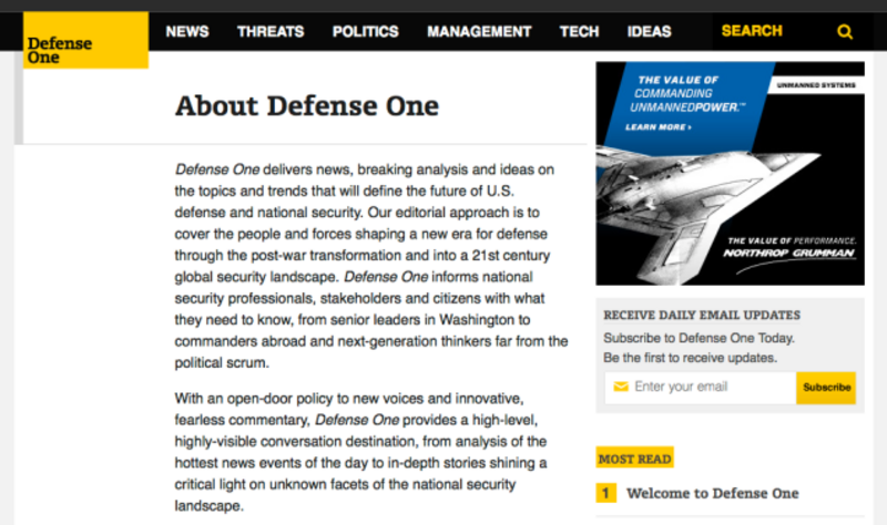 Atlantic Media, the proud publisher of The Atlantic, has launched a new publication: Defense One, a publication whose stated purpose is "To suck the dick of Northrop Grumman." Oh, wait.
