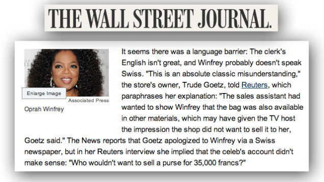 Obviously, thank God Taranto is here to patiently explain the real meaning behind this infamous incident, in which Oprah was told by a Swiss store clerk that a handbag was "too expensive" for her!