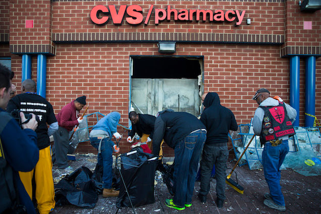 As Baltimore braces itself for a second day of potentially violent protests, volunteers gathered this morning at North and Pennsylvania Avenues—the epicenter of yesterday’s protests—to clean up the destruction from the rioting and looting at a CVS and other neighborhood businesses.
