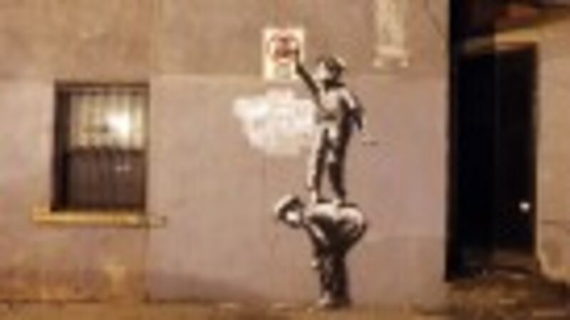 The original Banksy piece showed one kid standing on another kid's back, reaching up to grasp a spraycan that was on a sign reading "Graffiti Is a Crime." Last night, apparently, Smart Crew came along and replaced Banksy's sign with their own sign, showing their logo and reading "Street Art Is a Crime," as you can see in the photo above, from Animal NY.