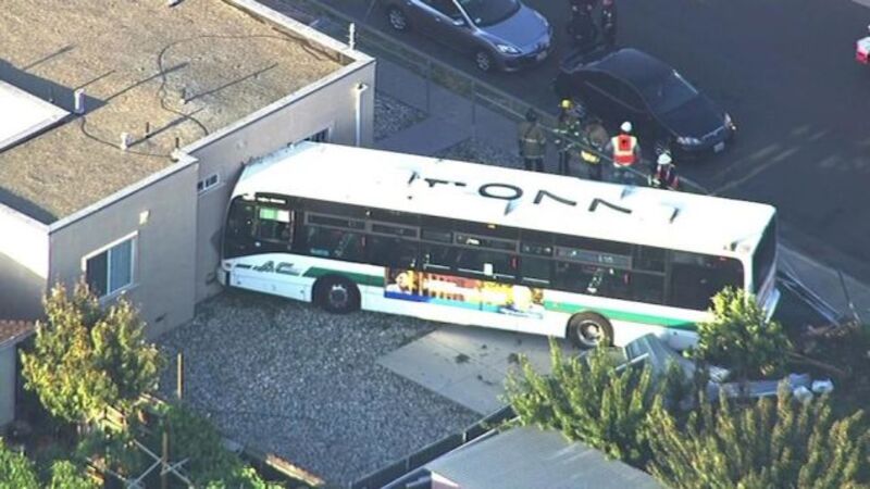 A commuter bus in Richmond, Calif. was hit by a stolen Honda on Friday evening, causing the bus to swerve into an area home, injuring eleven people. Police say none have serious injuries.