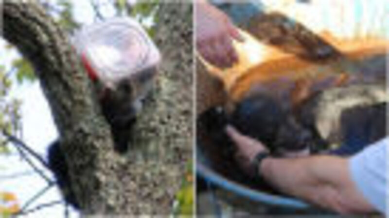 As the 28-pound animal tried to eat what remained in the jar, he apparently pulled the jar over his head and it got stuck.