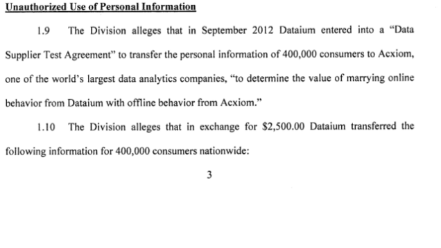 The peek into the exciting world of data-brokerage comes from this just-released agreement between the New Jersey division of consumer affairs and the impossibly sinister-sounding analytics company Dataium over a couple of bad things they did. (pdf) Most interesting is that Dataium shadily bought personal data on 400,000 people from another, even more sinister-sounding analytics company called Acxiom, one of the largest so-called "data-brokers" in the country. The data included the name, phone number, email address, and various data about their behavior on car shopping sites. Dataium was considering using the info to help their clients better market to users.
