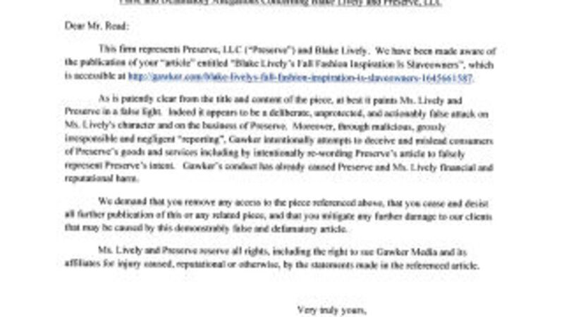 We love hearing from our readers, even when they've got complaints. Yesterday we heard—through a lawyer—from actress Blake Lively, who demanded that we take down yesterday's post "Blake Lively's Fall Fashion Inspiration Is Slaveowners" (which you can read below):