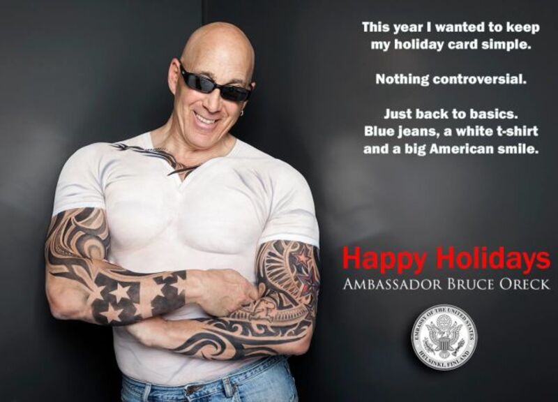 Among other things, Bruce Oreck is a former body-builder, the son vacuum magnate David Oreck and the U.S. Ambassador to Finland. But far more importantly, he's the winner of the State Department's (imaginary) "Best Christmas Card" contest three years running, thanks to ambitiously weird images like this one, released via Oreck's Facebook on Wednesday.