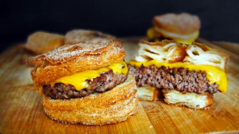 The burgers are the deformed, ghastly brainchildren of Toronto burger joint, Epic Burgers and Waffles (in collaboration with a local bakery). They consist of a beef patty, yellow processed cheese, optional egg, optional bacon, and a "cronut" bun topped with something called "maple bacon jam" that looks like maple bacon jam after a dog threw it up in your bed.