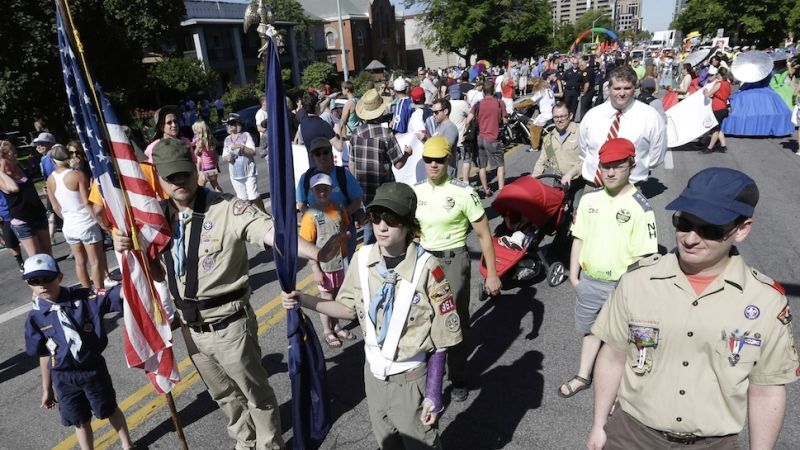 Boy Scout troop leaders Peter Brownstein and Neil Whitaker marched in the June 2 parade, with Whitaker in uniform, despite warnings from the organization that such a move would violate the group's policy against promoting political agendas.