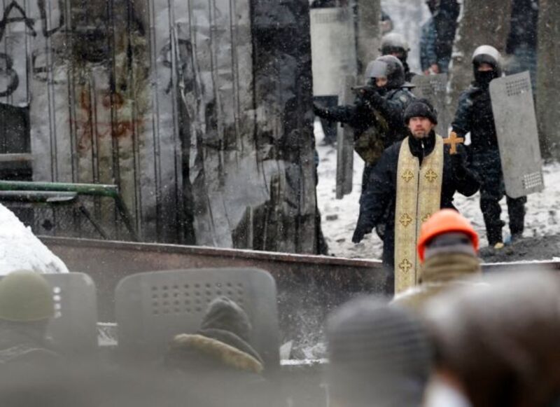[Protesters clash with police in central Kiev on Wednesday. Three people have died in clashes between protesters and police, according to medics on the site. Image via Sergei Chuzavkov/AP.]