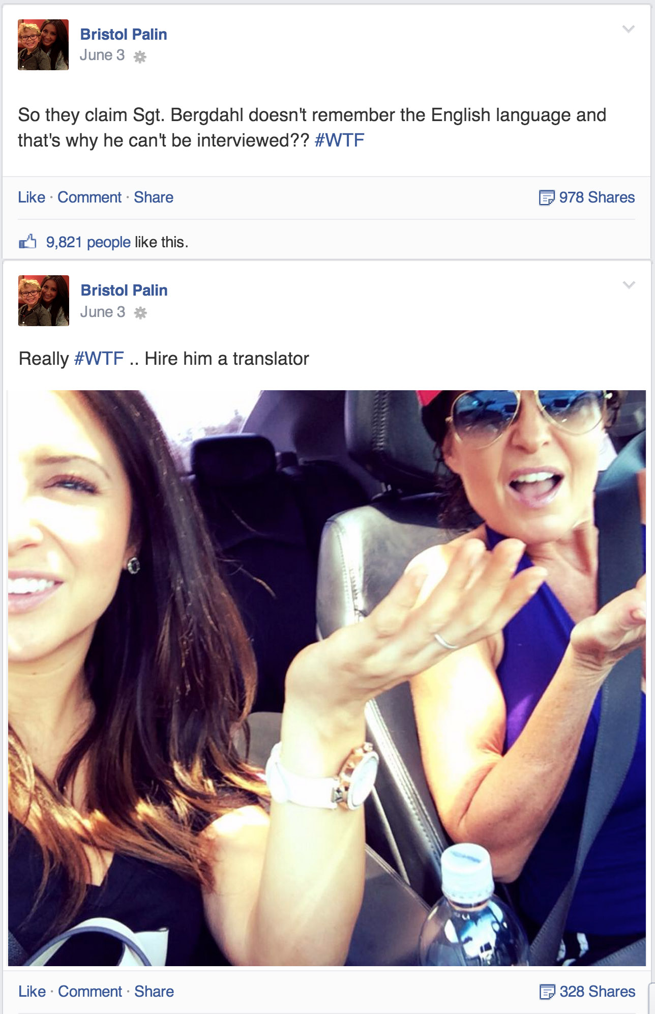 Bristol and Sarah Palin Have This Bowe Bergdahl Thing All Figured OutAdam Weinstein6/06/14 1:02pmFiled to: smart takebristol palinsarah palinbowe bergdahlmilitarypolitics1655EditPromoteDismissUndismissHideShare to KinjaToggle Conversation toolsGo to permalink Reply165 repliesLeave a reply