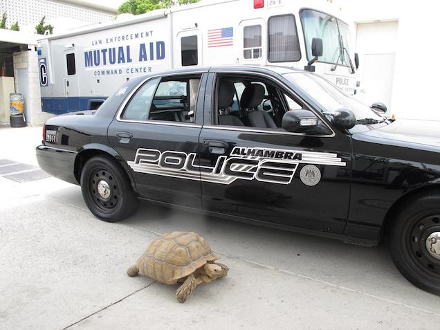 California's Alhambra Police Department put out an APB on Facebook after two officers found the tortoise roaming a residential street in Los Angeles yesterday. It didn't take long for the tortoise's family to come forward and claim him: