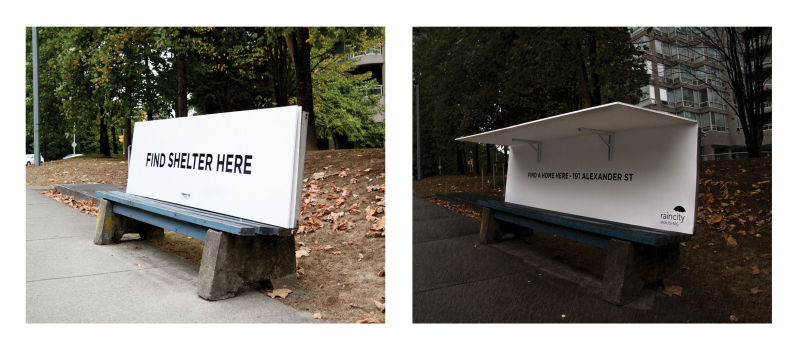 The company specializes in accommodation and support services for the homeless in Vancouver. They used designs that feature welcoming slogans on the bench backboard. During the daytime, the benches are places to wait for a bus or sit. At night, they convert into usable shelters where the backboard lifts up to provide shelter.
