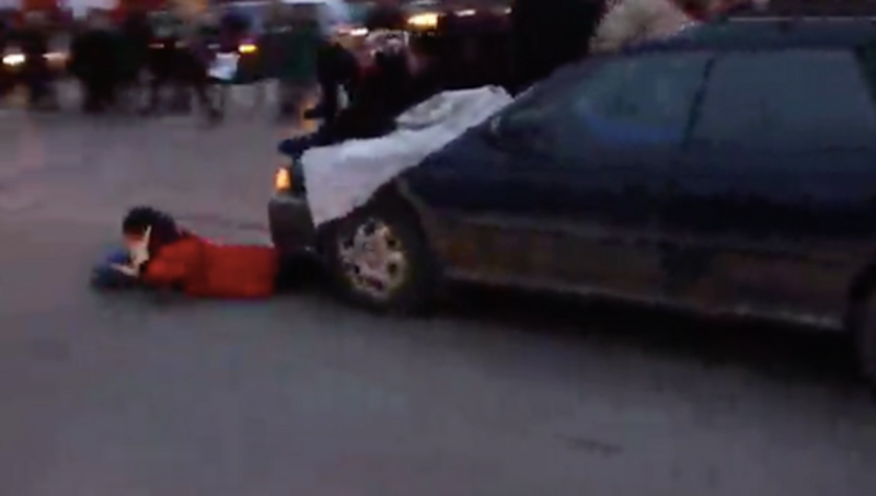 Moments after the woman was struck, a group of demonstrators pounced on the hood of the vehicle, while others tried to free the victim. Witnesses say that the woman's leg was caught under the car.