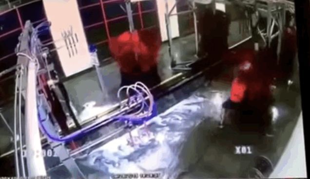 He did say, however, that the mishap was scarier than anything he experienced during his service in the military, because he was afraid the scrubber would fling him into its metal support poles. But it didn’t, so we now have this footage of an industrial machine brutalizing him like Charlie Chaplin in Modern Times ...
