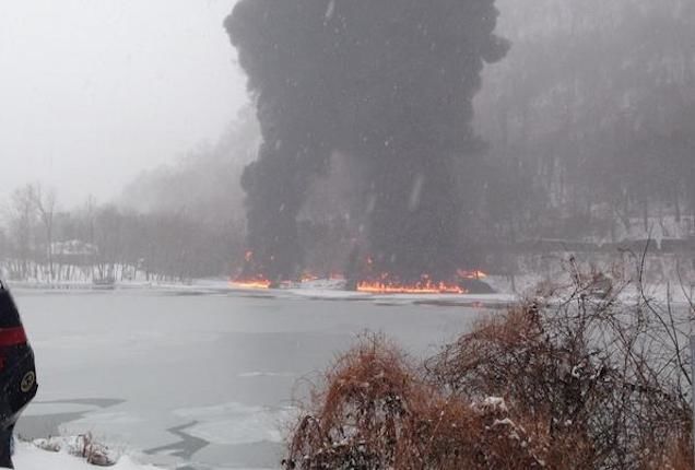 A CSX train carrying crude oil burst into flames this afternoon after derailing in Fayette County, West Virginia. One rail car careened into a nearby house, setting it on fire, and at least one other crashed into the Kanawha River.