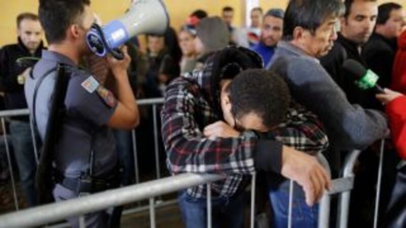 Carlos Valentin reacts after learning that tickets for some of Brazil's World Cup soccer games are sold out, as he stands outside São Paulo's Ibirapuera Gym with other fans hoping to buy tickets on Wednesday. Tickets for the opener sold out as fans lined up in the cold to try to buy what was left for the other matches. Image via Nelson Antoine/AP.