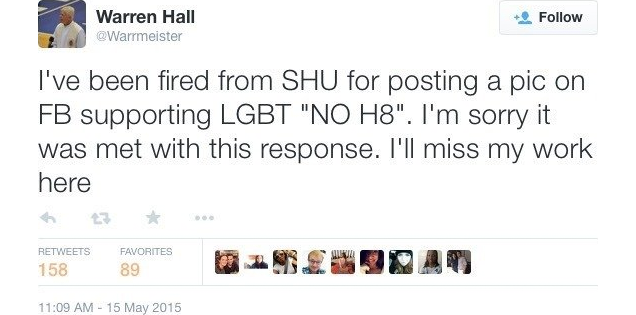 According to Hall, the offending post was an image promoting the NOH8 campaign, originally formed to fight California’s same-sex marriage ban. From NJ.com: