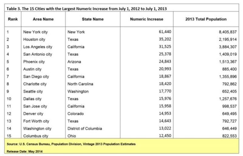Newly released Census figures covering July 2012-July 2013 confirm a few things: Americans are now flocking back to the South and West, ignoring its blistering drought and fiery chile-drenched food; tons of people are moving to the towns in the deserts of Texas in pursuit of the new oil boom, despite the damning evidence that such towns are located in Texas; and, yes, people continue to move into cities and away from suburbs.