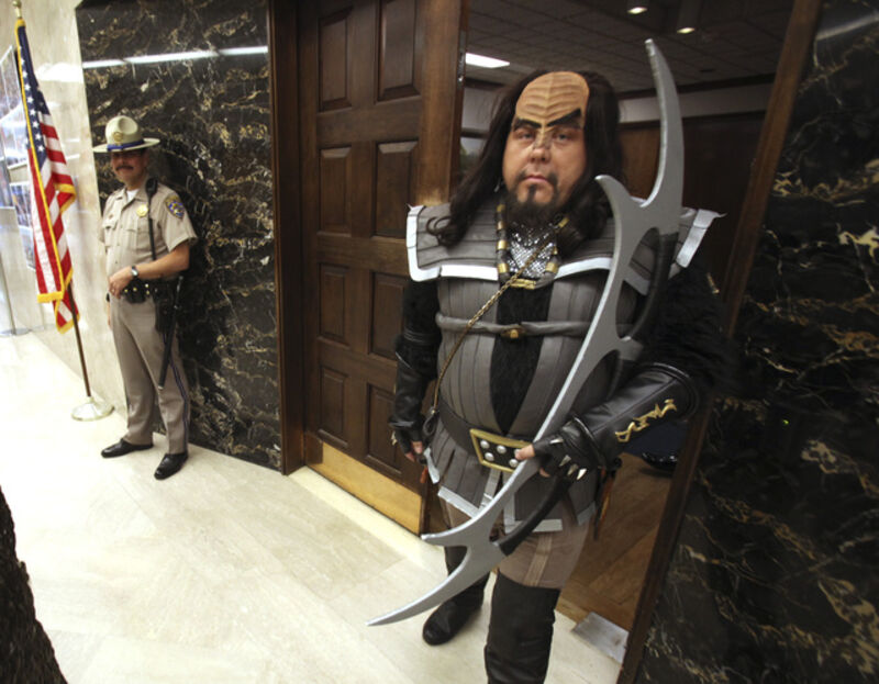 [In this 2009 AP photo, a Klingon groupie (not David Waddell) leaves the California Capitol; resignation letter courtesy of the Charlotte Observer]