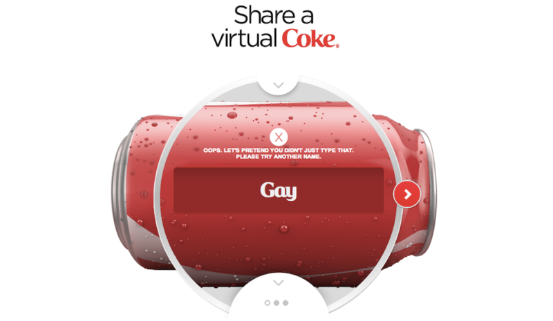 Part of the marketing plan is a website that lets users customize a virtual Coke can. Although the app blocks explicit words, it allows users to write pretty much whatever they want. Unless they want to write the word "gay" (or "gays").