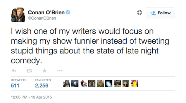 A long-time writer for Conan O’Brien went on a quickly-deleted Twitter rant last week about the current late night comedy landscape, resulting in a less-than-flattering response from his boss Sunday.