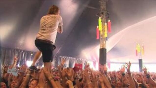 This is, apparently, David Achter de Molen, the lead singer of a band called John Coffey, at something called Pinkpop Festival 2015, in Holland, catching a thrown cup of beer while walking across the crowd.