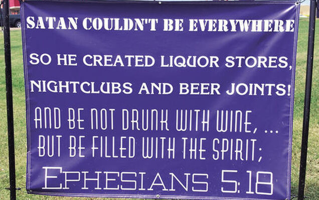 Just recently in Dyersburg, Tennessee, a number of custom-made purple signs materialized around the 17,000-person town, alerting local drinkers they were unwitting pawns of the Devil. Strategically placed across from alcohol purveyors, the banners proffered these admonishments: