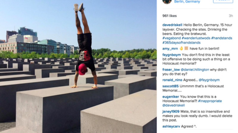 There are few things as funny as crazed Crossfit evangelism. There are also few things as funny as someone doing something dumb and narcissistic at a war memorial. This weekend, the two finally and inevitably met, when famous Crossfit evangelist Dave Driskell did a handstand on top of the Memorial to the Murdered Jews of Europe in Berlin.