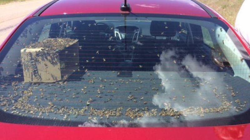Cops in Montana had to let the driver of this Final Destination-looking motor vehicle go with just a ticket last week. Turns out the state legislature, for some strange reason, never thought to write laws governing the voluntary transportation of thousands of bees in the backseat of a sedan.
